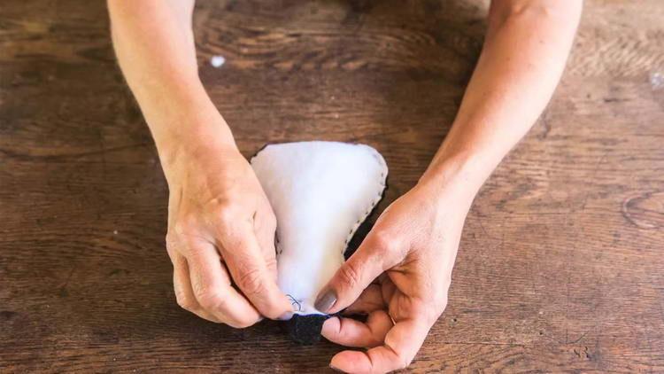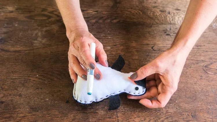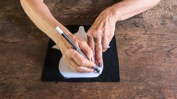 - Ту частину тулуба, де пінгвін з широкими лапками і з гребенем, «язичком» на голові, прикладаємо до фетрової тканини чорного кольору і обводимо (так як олівець або маркер на чорній тканині видно не буде, рекомендується взяти гострий шматочок сухого мила або спеціальний білий олівець).