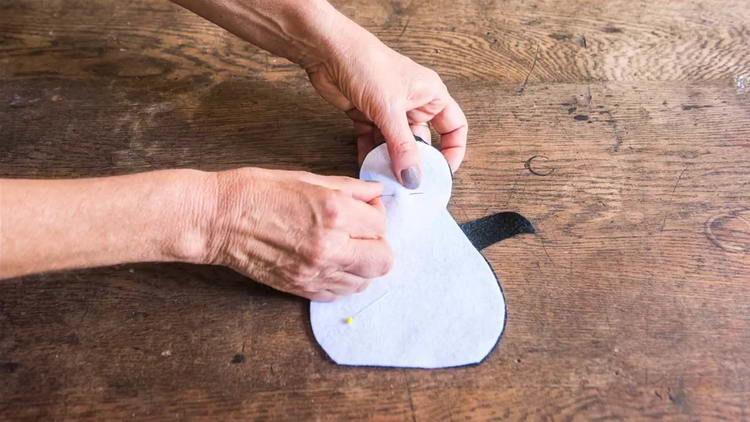 - Беремо нитку з голкою і акуратними стібками зшиваємо їх між собою (стібки треба робити максимально рівними, так як вони залишаться зовні), залишаючи невеликий отвір в області голови.