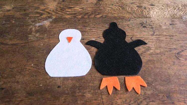 - Із залишків чорного фетру вирізаємо невеличкі вічка для пінгвіна і також приклеюємо їх.