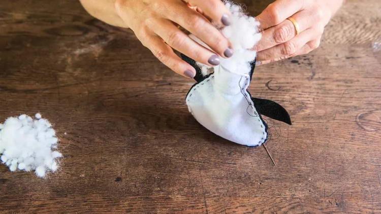 - Потім рвемо на шматочки холлофайбер і розміщуємо його в іграшку (холлофайбер необхідно взяти стільки, щоб пингвинчик вийшов досить щільним і добре тримав форму).