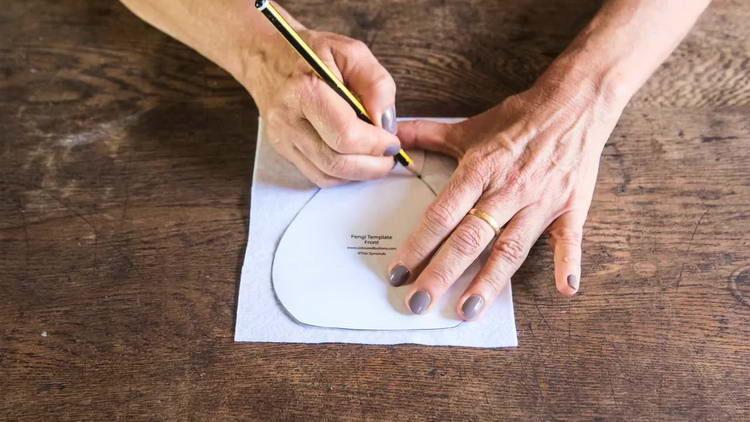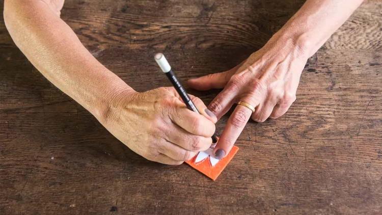 - Лапки і дзьоб прикладаємо до помаранчевої тканини і також обводимо.