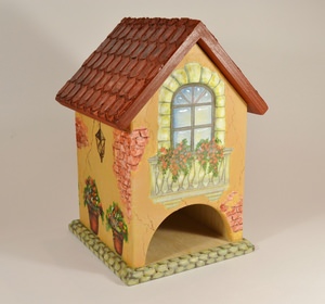 Для того щоб картинки на будиночку виглядали яскраво, картонну основу покривають білою акриловою фарбою в 2 шари. Від серветки відокремлюються всі зайві шари і залишається тільки частина з малюнком. Стіни будиночка, на які буде приклеєна серветка, як слід змазують клеєм. Приклеюється серветка від центру до країв, щоб максимально уникнути міхурів і нерівностей. Поверх малюнка теж наноситься шар клею. Подальше декорування на свій розсуд: порожні частини можна покрити дрібними шматочками яєчної шкаралупи, додати малюнок акриловими фарбами або імітацію цегляної кладки.