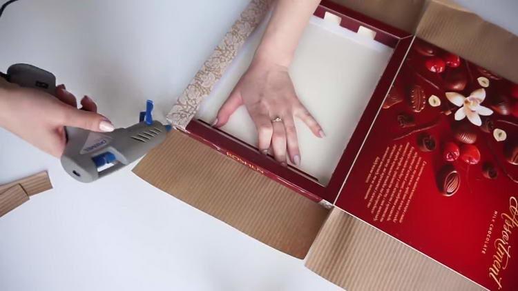 - Далі візьміть порожню коробку цукерок і оберніть її в крафт-папір. Папір приклейте до коробки за допомогою термоклея. Проклейте акуратно всі ділянки, де видно оригінальна упаковка з-під цукерок. Для зручного обгортання робіть надрізи на папері.