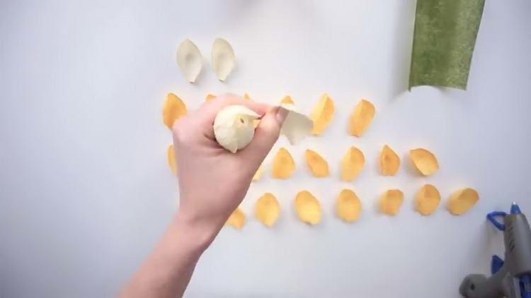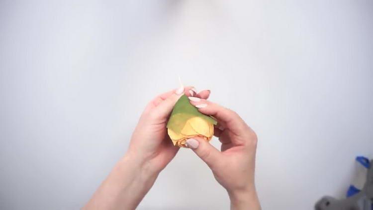 - Кожна пелюстка необхідно увібгати всередину, надавши йому природну форму. Приклеюються пелюстки в нижній частині, формуючи тим самим бутон. Останній шар можна зробити зеленим, щоб підкреслити сам бутон.