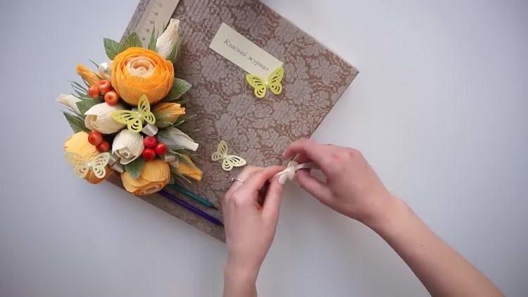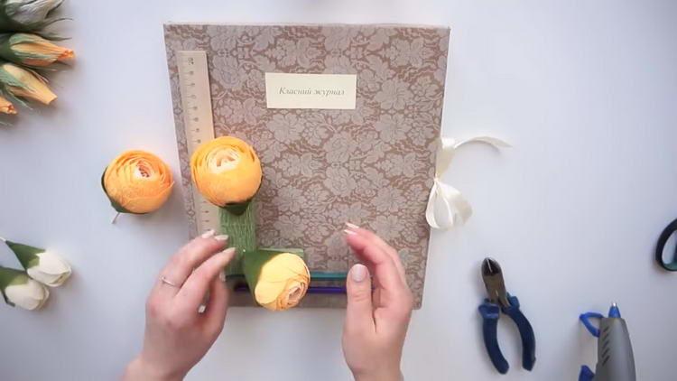 - Далі до журналу приклейте клеєм 2-3 олівці, лінійку і невеликі брусочки пінопласту, обгорнені в гофровану папір. В пінопласт вставити заздалегідь підготовлені квіточки. Так як їх основа знаходиться на зубочистці, вони з легкістю увійдуть в структуру пінопласту. Також додайте штучні ягідки і паперові метелики.