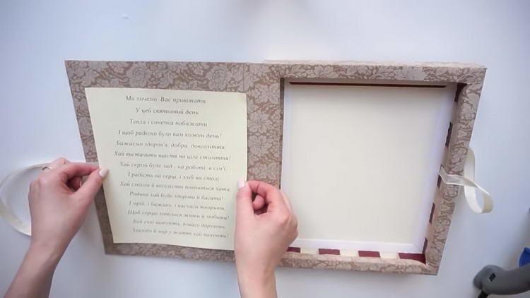 - Візьміть аркуш з побажаннями вчителя і приклейте до нього смугами двосторонній скотч. Приклейте цей лист на відкривається бік. Також за допомогою термоклея наклейте по центру коробки дві стрічки, які потім будуть зв’язуватися в бантик і закривати коробку. Поверніть цукерки у коробці.