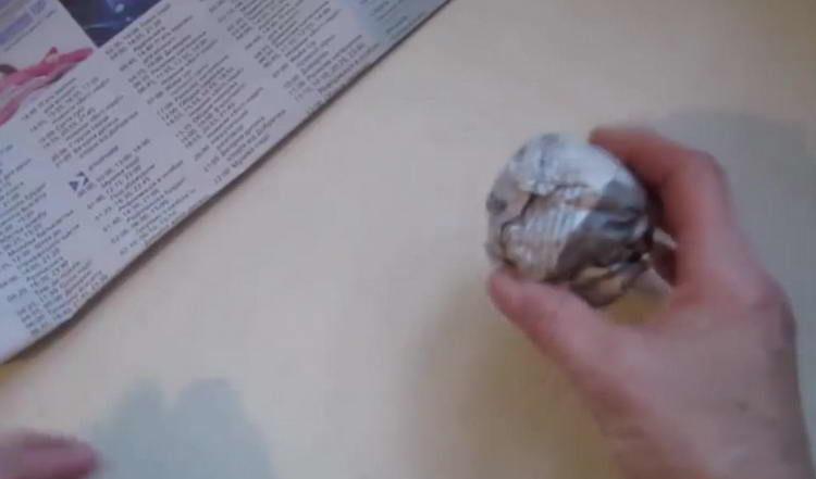 - Розірвіть на дві половинки газету (із загального числа в 3-4 шт.). Руками зімніть половинку газетного аркуша у грудку, надаючи йому круглу форму. Оберніть отриманий паперовий шар наступним шматочком газети, нарощуючи ком. Готовий великий шар повинен мати діаметр приблизно 8,5-9 див. Це буде тулуб сніговика.