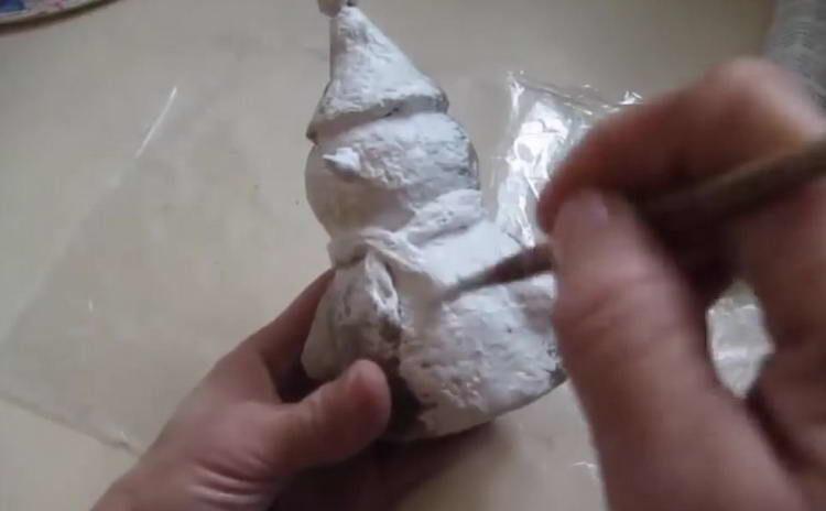 - Пофарбуйте сніговика білою акриловою фарбою (100 мл), дайте фарбі висохнути. Для прискорення сушіння використовуйте фен.