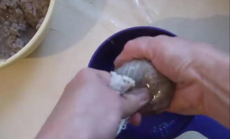 - В окрему глибоку миску покладіть шматочок марлі (30 см×30 см), викладайте паперову масу в марлю, віджимайте її від зайвої води. Віджату масу викладайте в ємність. Відіжміть всю суміш.
