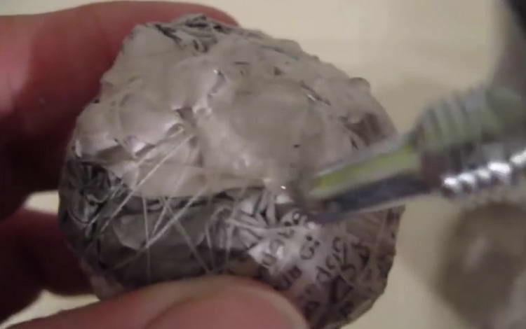 - Постеліть на стіл килимок з поліетиленової плівки (розріжте на дві частини файл або мішечок). За допомогою пензлика промажте поверхні куль клеєм ПВА (100 мл). Краще використовувати будівельний клей: його скріплюють характеристики вище, він швидше схоплюється. Дайте заготівлях висохнути.