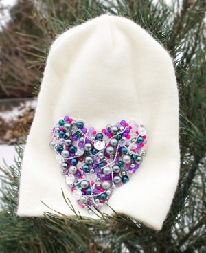 Звичайна одноколірна шапочка-біні перетворюється у прекрасний і дещо нереальний аксесуар за допомогою великих кольорових страз різної форми, які пришиваються на резинці шапки в певному порядку. Такий головний убір не захочеться зняти навіть в приміщенні! Можна вишити на шапочці візерунок вовняними нитками і вже готовий розшити намистинами і стразами. Розшиті таким чином шапки можуть виглядати дуже цікаво.