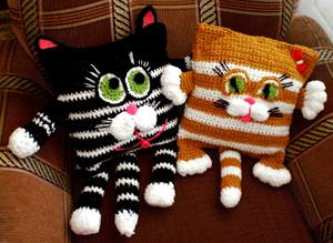 Внутрішня наволочка. Квадрат 35 на 35 см Від верхнього краю відкласти 12 см вниз і вбік. Отримані трикутники зрізати. Сострочить на машинці або вручну. Набити синтепоном.- Основне полотно. Квадрат 35 на 35 см в’язати перловим візерунком. Надіти на готову подушку. У верхні кути підкласти синтепон і прошити ниткою, злегка стягуючи. Таким способом формуються вушка котика.