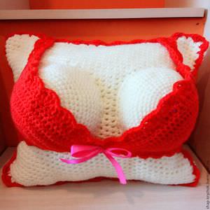 Чохол. Зв’язати прямокутне полотно по довжині в два рази більше подушки. Скласти удвічі і зшити з двох сторін. Одна сторона залишається не зашитої.- Груди. В’язати дві деталі. Ланцюжок з 70 петель замкнути кругом. Пров’язати без збавляння 1 див. В’язати ще 7 рядів без убавок. У 8 ряду зменшити кожну 17 петлю. Продовжити збавляння ще 18 рядів. У наступних рядах зменшити 5 кожну петлю. Останні п’ять рядів в’язання, можна виконати рожевим кольором для імітації сосків.