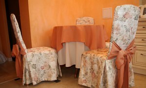 Яскраві червоні драпірування на стільцях відмінно підійдуть до Новорічних свят. Накидки на стільці з барвистим візерунком, в строкату клітку або прикрашені кольоровими помпонами, створять святковий настрій на дитячих заходах. Лаконічні строгих кольорів гарні для сімейних урочистостей. Для кухні можна створити окремий ансамбль, підібравши тканина для чохлів в тон загальним кольором приміщення.