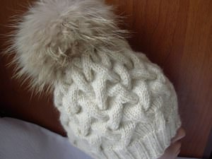 - Наша шапочка з візерунком коса з тінню майже закінчена, і ми знімаємо спиці. При цьому через петлі необхідно протягнути нитку для закріплення. Для цього використовуйте гачок для в’язання. Щоб сховати залишився шматочок нитки після завершення процедури, заправте її всередину і виверніть шапку. Нитка добре витягаємо і фіксуємо її зав’язуючи на виріб за допомогою гачка. Після, краєчок обрізаємо або ховаємо за допомогою того ж гачка для в’язання.