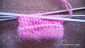 перший ряд потрібно зв’язати згідно класичної гумці 2 на 2;- у другому ряду лицьові петлі потрібно провязать з лицьовими з попереднього, потім робимо дві виворітні петлі;