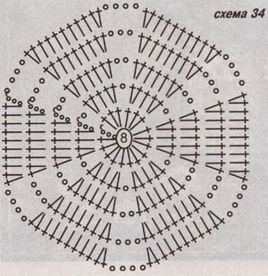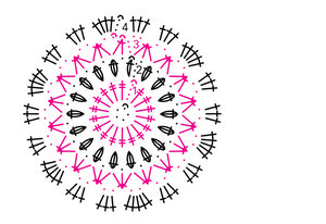 - Всього у другому ряду робимо вісімнадцять великих стовпчиків з усіх петельок першого ряду, між великими стовпчиками робимо одну повітр.п. Завершуємо ряд соед.ст. вгору першого пишного ст.