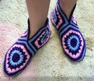 Тапки складаються з трьох великих шестикутних мотивів, для їх в’язання потрібно брати пряжу різних кольорів. Пряжа для виготовлення плетених виробів повинна бути дуже товстою, якщо тонкі ниточки, то з’єднайте їх в три складання.