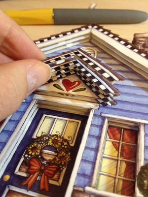 Вирізані деталі приклеюються на основну картинку, з якої ще не було вирізано. Наступні шари необхідно трохи піднімати над першим. Для цього новий шар картинки обов’язково потрібно закріпити на деяку кількість гофра картону за допомогою скотча, який ми приготували (двосторонній). Необхідно наклеювати великі деталі, а після них дрібні. Детальки, оточені з усіх сторін папером краще, звичайно, вирізати канцелярським ножем, підклавши під картинку спеціальний килимок для скрапбукінгу.