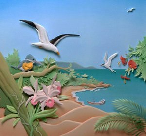 Почнемо з моря. Його треба вирізати, обводячи ножицями лінію берега і інші детальки. Кожен наступний елемент — це новий шар картини. У самому верху можуть знаходитися такі дрібні детальки, як чайки і хмари. Море вирізають в першу чергу, так як тоді буде здаватися, що берег ближче до нас, за обрію пливе яхта буде відчуватися обсяг картини. Для зручності в роботі краще всього використовувати канцелярський ніж або спеціальний ніж для скрапбукінгу, тому як наш малюнок більше видавлюється, чим вирізається. Ножичками можна буде прибрати всі надлишки папери, які з’являться під час нашої з вами роботи.