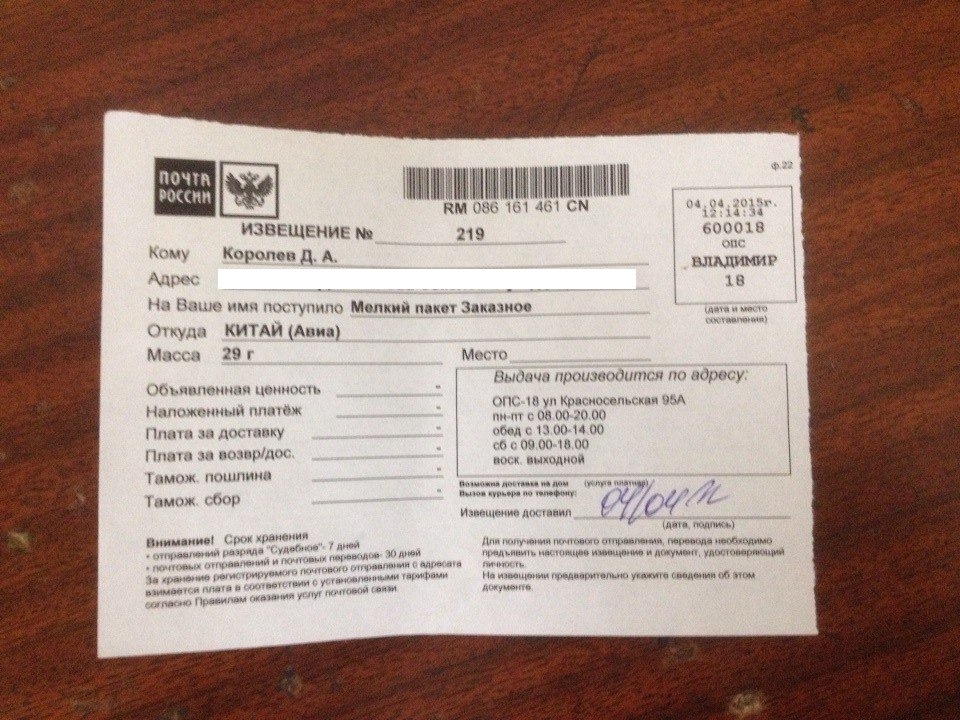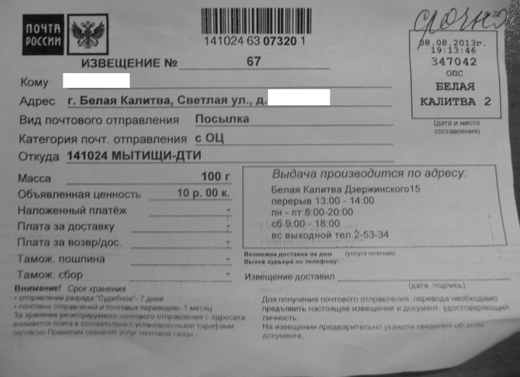 На пошті встановлені певні строки для зберігання листів і посилок. Після того як ваш товар прибув на пошту, листоноша приносить повідомлення. Якщо з якої-небудь причини ви не отримали повідомлення або пропустили встановлений термін, рівний 5 днів, приходить друге.