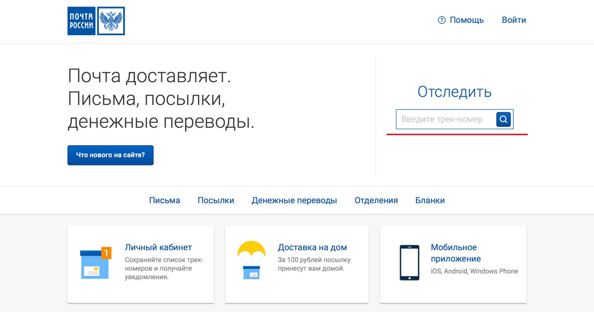 - На сайті пошти Росії. У спеціальному полі потрібно ввести трек-номер, який видається при замовленні товару або відправленні. Номер відрізняється, залежно від того, міжнародна пересилання чи всередині країни.