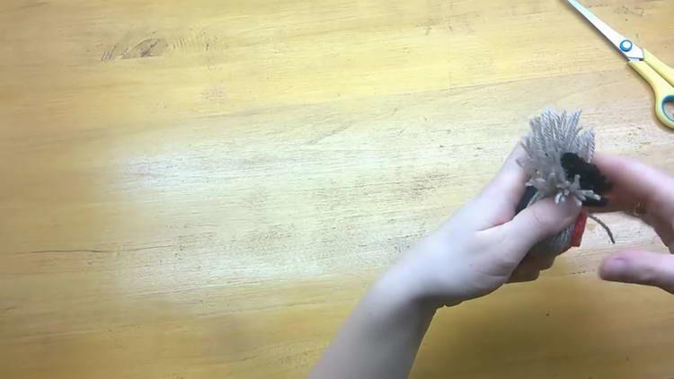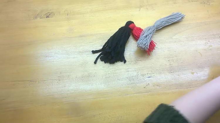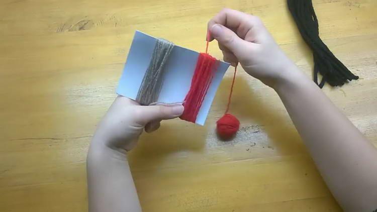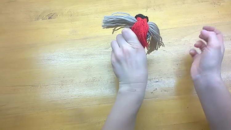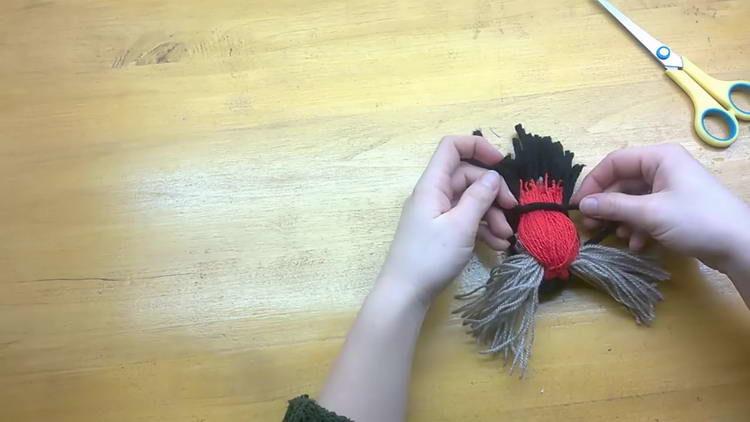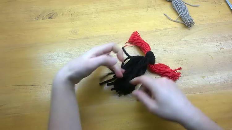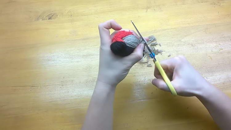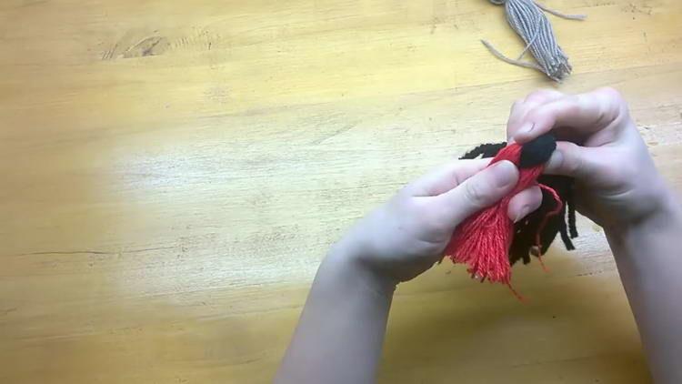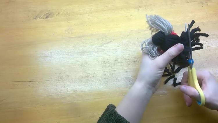- Акуратно відрізаємо краю червоної і чорної пряжі, але не дуже коротко, щоб снігур з помпонів не розпався. Саме це і буде хвостик нашого виробу.