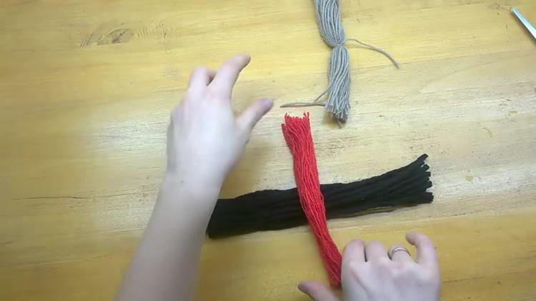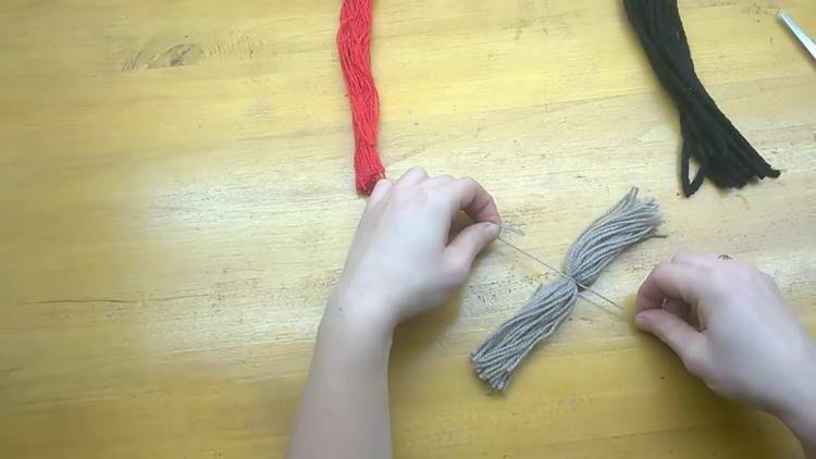 - Також перегинаємо навпіл червону пряжу, і пов’язуємо ниткою такого ж кольору.