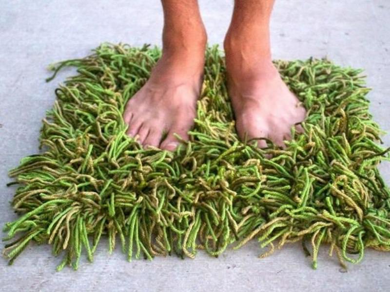 Прийоми утилітарного рукоділля дозволяють створювати найрізноманітніші предмети декору. Для прикраси свого будинку рукодільниця варто звернути увагу на досить незвичайну річ — килимок з травичкою. Це чудовий виріб імітує зелену траву. Їм можна прикрасити ванну кімнату або ж постелити на дачі.