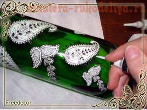 Будь-яка скляна пляшка отримає друге життя, якщо її розписати. Така прикрасить дім, і свято, послуживши посудиною для рідин або вазою для квітів. Зручніше всього використовувати при цьому заздалегідь вирізані шаблони або наклеєні поверх трафарети.