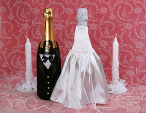 Зараз досить модно декорувати шампанське, вбираючи скляну поверхню в костюми нареченої і нареченого. Цей спосіб використовується часто, але є безпрограшним. Класичний варіант не вимагає багато зусиль і кидається в очі.