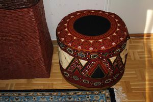 Спочатку ви повинні скріпити пластикові пляшки з допомогою скотчу в круглу форму. Після цього вирізати два картонних диска, рівних діаметру кола пляшок, і помістити їх нижче і поверх пляшок. Потім покрийте всі сторони цього циліндра поролоновими листами чи м’якими накладками. Зшийте верхню кришку і боки з будь-якої тканини, прикрасити вишивкою або іншим візерунком. Все готово для комфорту та краси вдома!