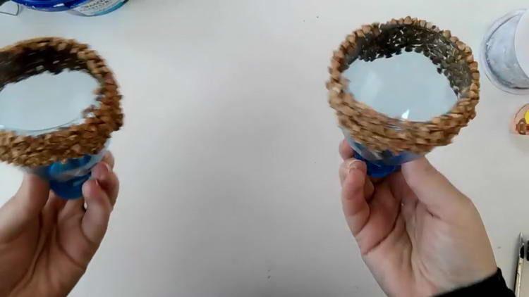 - За допомогою цієї ж дроту і клейового пістолета оформляємо низ у пляшки.
