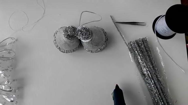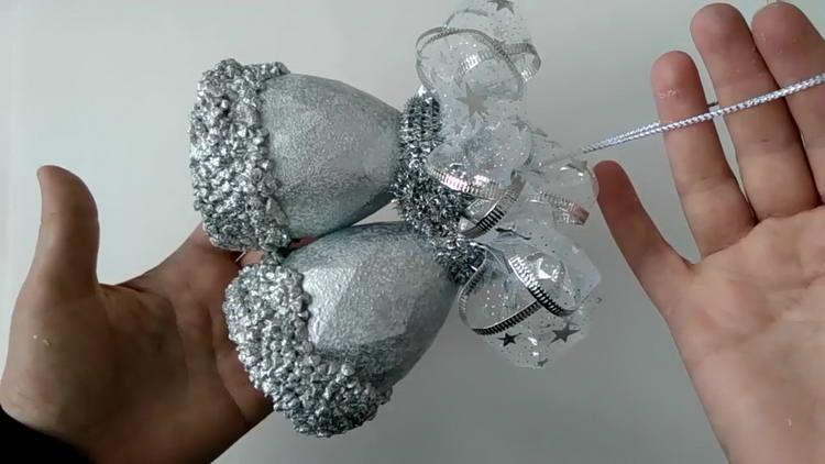 - Приклеюємо бантики зі стрічки за допомогою клейового пістолета на верх кожного дзвоника.
