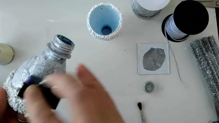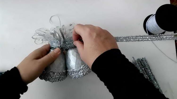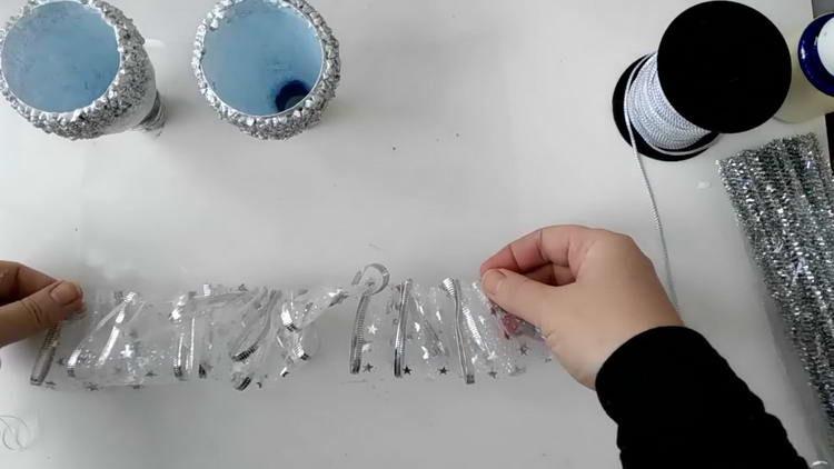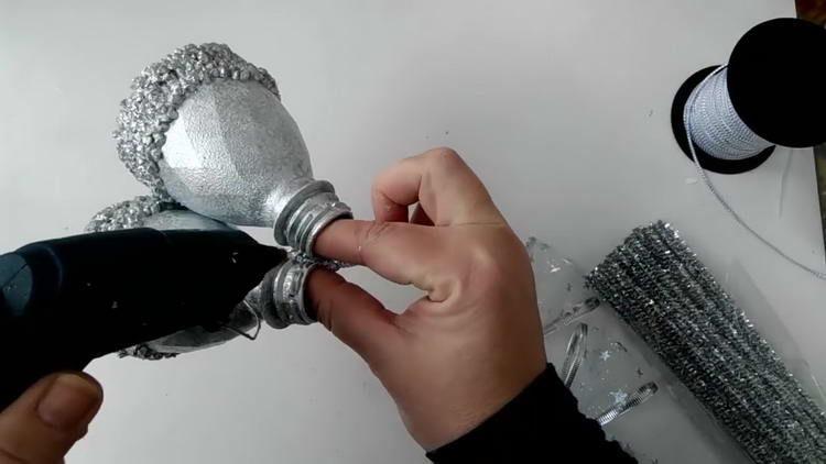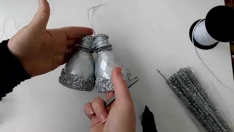- Дріт з блискітками звертаємо в коло і приклеюємо до шийки пляшок, щоб кожен наш дзвіночок своїми руками на Новий рік виглядав красивим і акуратним.