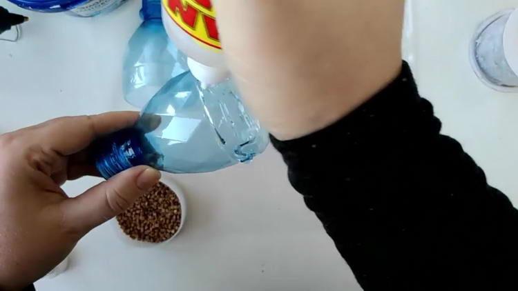 - Наносимо клей «Титан» на нижню зовнішню і внутрішню частину відрізаних верхівок пластикових пляшок. Для цього краще перелити клей в зручну пляшку з загостреним кінчиком.
