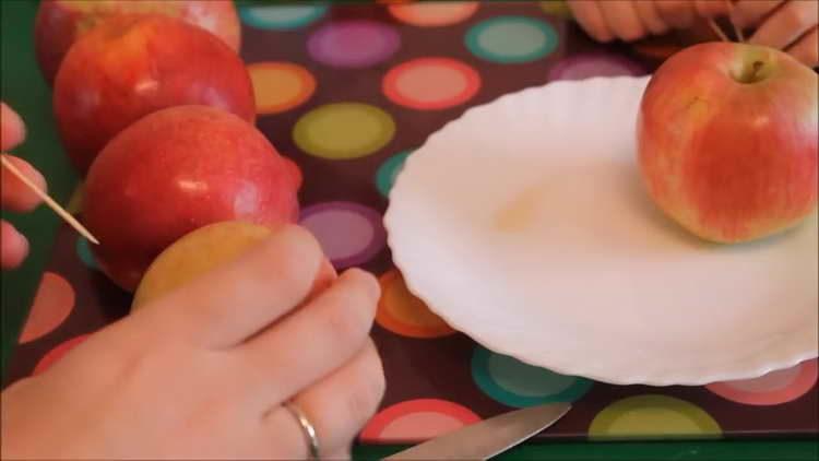 - З шостого яблука робимо голову. Прикріплюємо його зверху на перше яблуко за допомогою зубочисток.