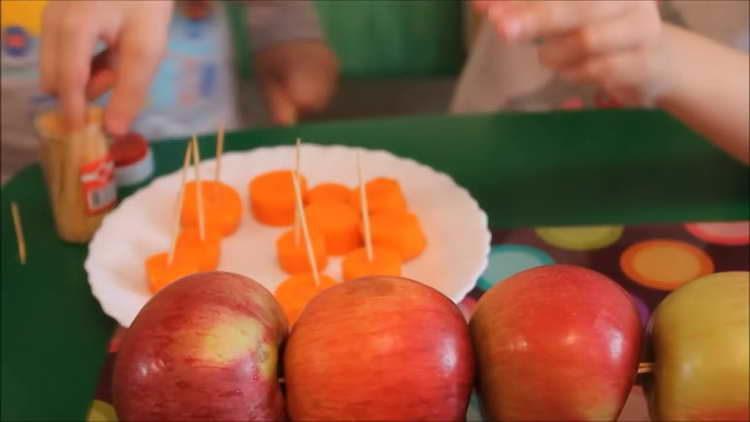 - До кожного яблуку знизу прикріплюємо по 2 пари ніжок із зубочисток і моркви.