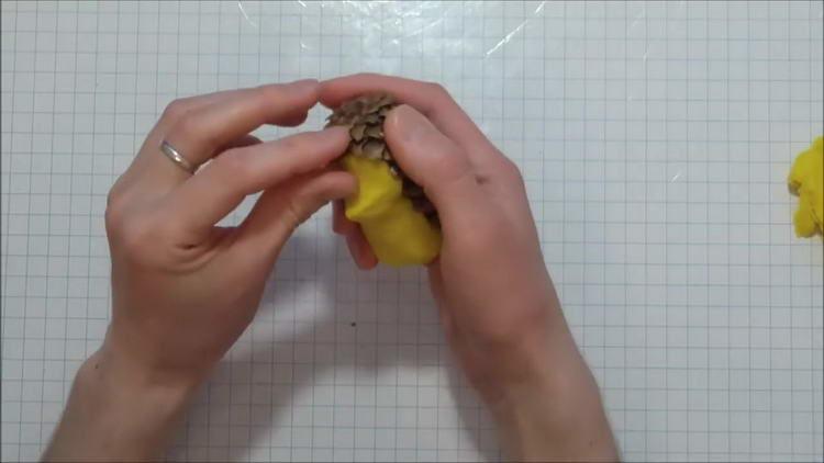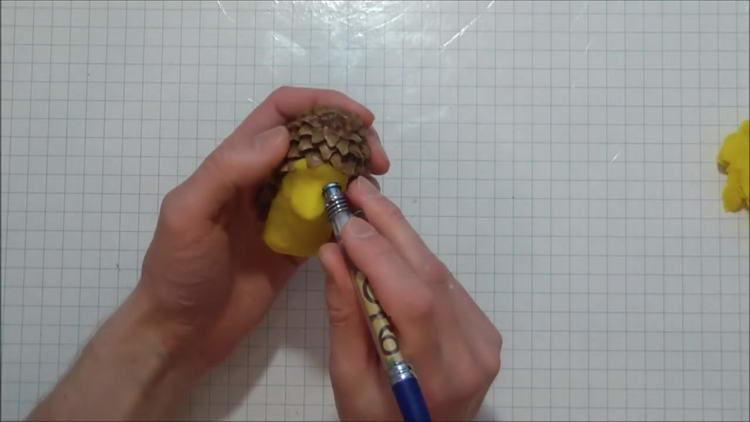 - Далі зробіть всередині заглиблення для пластиліну таким чином, щоб залишок шишки нагадував зачіску і голки їжачка.