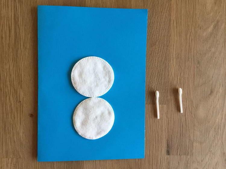 - Простим олівцем зробіть невеликі позначки в тих місцях, де буде розташована аплікація. Нанесіть на кожен з 2-х ватяних дисків невелику кількість клею ПВА з одного боку. Приклейте ватні диски на олівцеві позначки. Один ватний диск зображує голову сніговика, другий – тулуб.