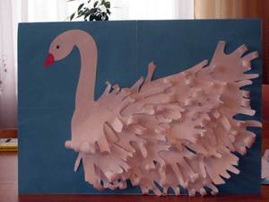 - З аркуша білого паперу виріжте лебедину шию і головку з дзьобом. Наклейте фігуру на основу.