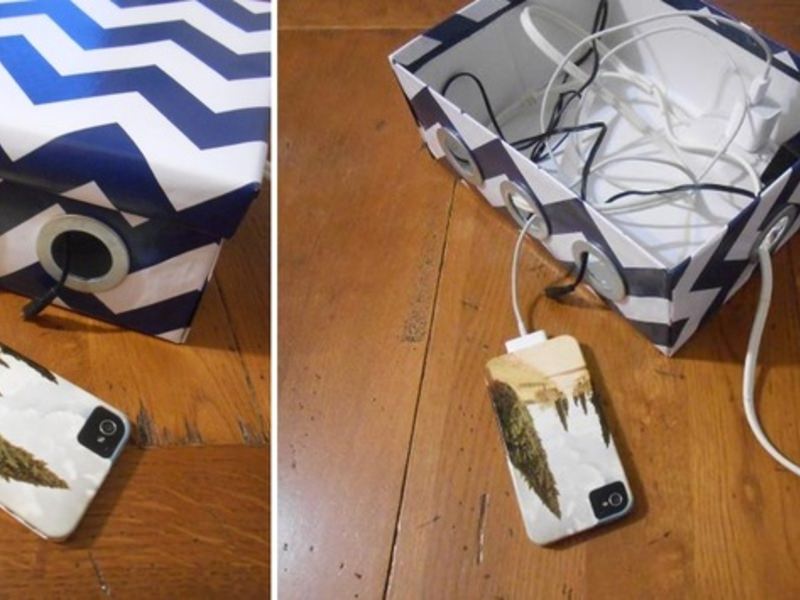 Людям, яким знайома проблема вічно запутывающихся проводів, особливо підійде наступна виріб. Часто трапляється, що дроти плутаються між собою, і розібрати, до якої зарядці веде певний провід, стає дуже важко. Щоб запобігти виникнення плутанини, можна скористатися порадою нижче і спорудити невеликий ящичок для зарядних пристроїв. Зробити його дуже просто: потрібно всього лише невелика коробочка, наприклад, з-під взуття і розетка-переноска, а далі