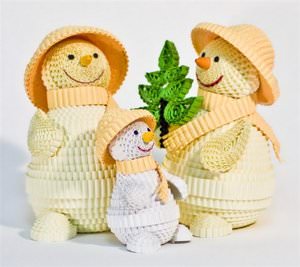 Наступна виріб являє собою невелику статуетку сніговика, зроблену за допомогою особливої техніки — квіллінг з гофрокартону. Відмінна риса цієї техніки полягає в тому, що стрічка картону накручується на олівець, утворюючи коло, і з цих кіл складаються різні фігури. Квіллінг з гофрованого паперу або картону виглядає дуже оригінально, а робити їх своїми руками — цікаве заняття.