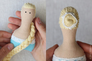 - Приклеїмо заготовку до голови лялечки. Після цього можна спокійно пришити її.