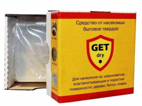 Продається у формі рідини, розфасованої в ємності по 100 мл Впливає як на дорослих особин, так і на личинок. Речовина відноситься до 4 класу токсичності і тільки в окремих випадках здатне завдати шкоди людині. Мух ж Get нищить наповал.