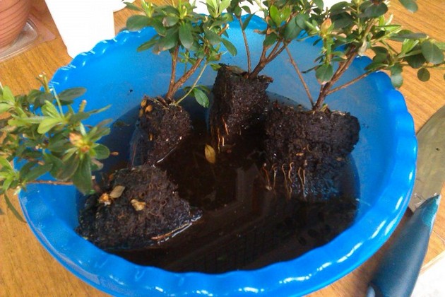 - якщо азалія посаджена в торф’яний ґрунт, здатний затвердіти при висиханні, час від часу опускайте горщик з чагарником у ємність з водою;