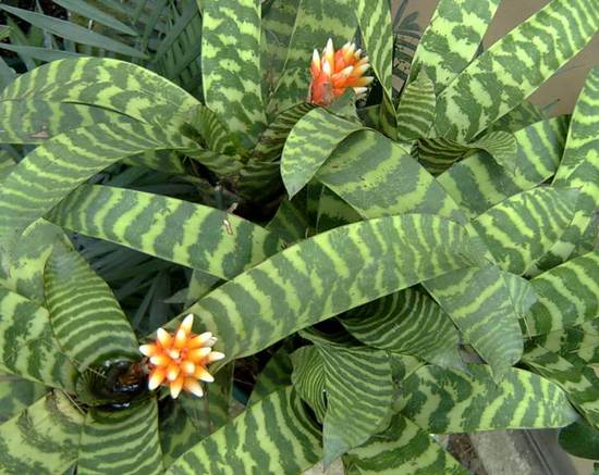 Відрізняється невеликим розміром куща. Листя вузькі і порівняно короткі, бувають зелені або смугасті. Прицветник добре помітний, так як може бути пофарбований в червоний, жовтий або бордово-зелений колір. Цвіте досить довго, після чого відмирає і випускає дочірні паростки.