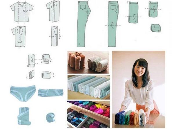 - Коли ви розібралися з потрібними і непотрібними речами, їх необхідно компактно розкласти. Марі Кондо пропонує зберігати одяг, склавши її прямокутниками, а дрібні деталі гардеробу скручувати в трубочки або складати навпіл. Це дозволить вмістити в невеликому просторі багато речей.