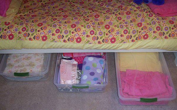 - Використовувати для зберігання одягу висувні ящики під ліжком. Якщо ви виберете цей спосіб, краще розкласти речі по пакетах, щоб вони не припадають пилом.