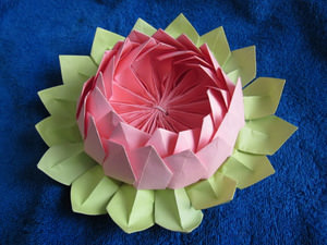 Після цього кути квадрата знову трошки підгинаються, але на цей раз не до центру. Більш тонка папір дозволяє легко підгинати папір, на відміну від щільного паперу. Паперову виріб необхідно знову перевертати на лицьову сторону. Потім необхідно почати розкривати пелюстки латаття. Робити треба все в шаховому порядку: спочатку відгинається перший ряд, після цього другий і на закінчення — третій ряд.
